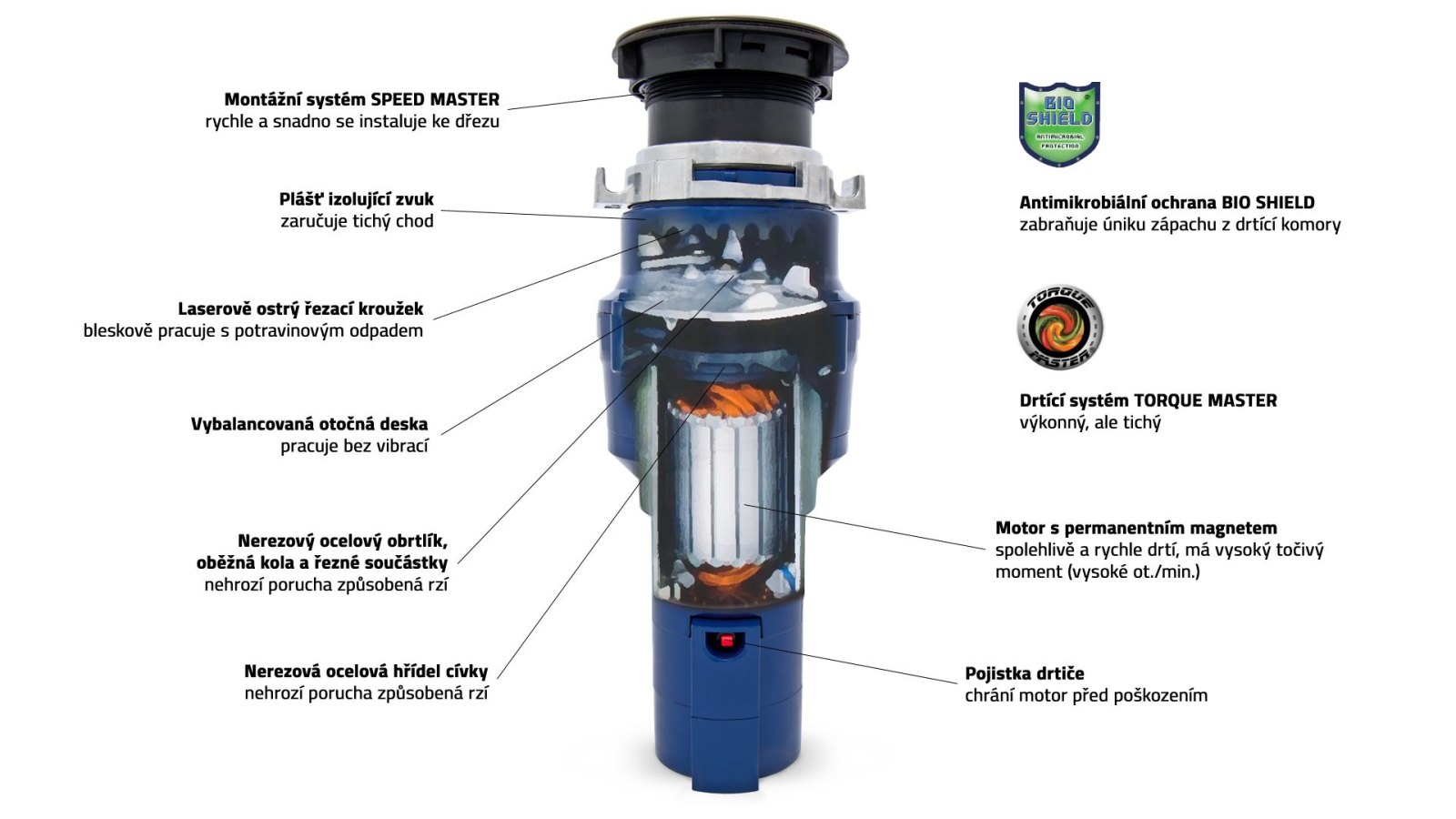• Waste Maid motory nabízejí maximální točivý moment, okamžitý rozběh a velmi vysoké otáčky, což prakticky znemožňuje zaseknutí přístroje.
