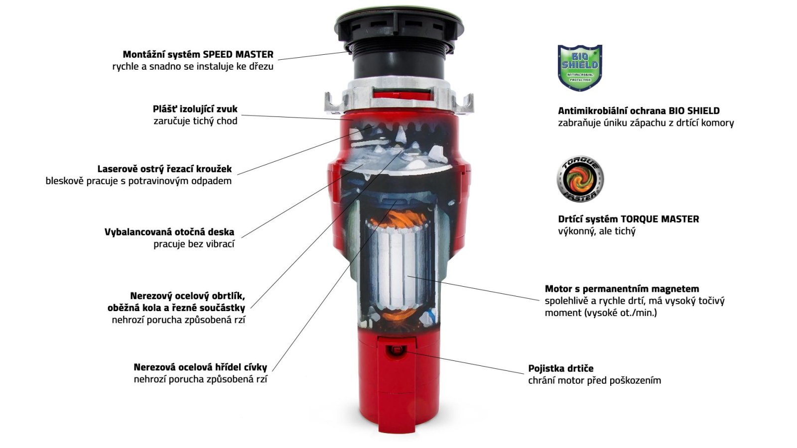 - Waste Maid motory nabízejí maximální točivý moment, okamžitý rozběh a velmi vysoké otáčky, což prakticky znemožňuje zaseknutí přístroje.